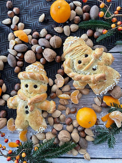 In celebration of Samichlaus, Grittibanz are made—little bread figures shaped from the same dough used for Zopf, a traditional Swiss braided bread. Decorated with raisins and pearl sugar, these sweet bread people can be enjoyed plain, with jam, or even with cold cuts and cheese.